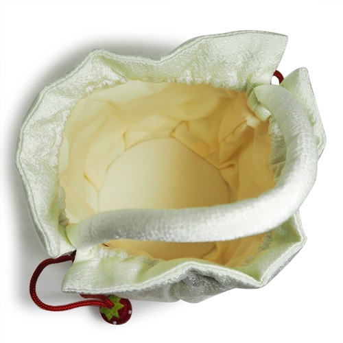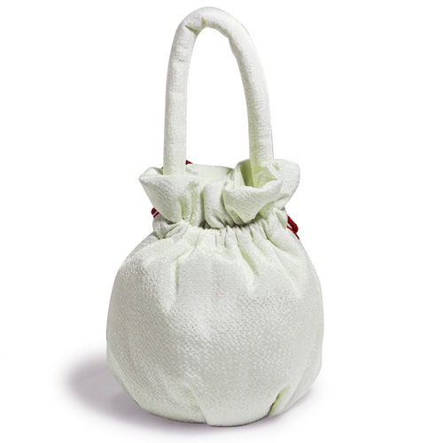 ちりめん地に桜とウサギがあしらわれ、ぷっくりとした形が可愛い巾着バッグです。巾着の紐の先にイチゴが付いています!!