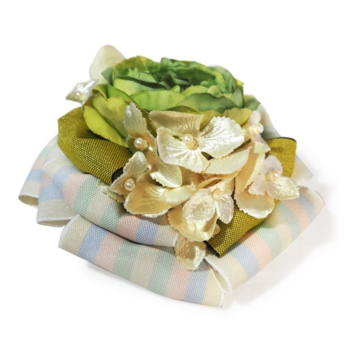 鮮やかな萌黄色のキャベッジローズの髪飾りです。 マットな色合いなのでとても落ち着きのある印象の花を真珠色のハイドランジアとリボン、ヨーグルトカラーの縞リボンが優しく包み込み、アンティークな雰囲気とリボンのフェミニンな雰囲気を感じます。 着物と合わせて明治大正のモダンなスタイルに。和風も洋風も合うオールマイティな飾りです。