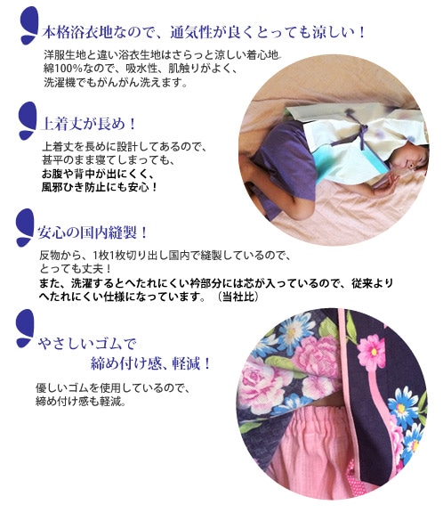 上着丈は少し長めで、お出かけや、お風呂上りの後に。 そのまま眠ってしまってもおなかを冷やさない丈になっています。 綿地なので、吸水性に優れ、お洗濯もラクラク。 浴衣地の特徴である着心地の良さと、涼しさは言うまでもありませんね。 クーラーを使わないエコな生活にピッタリの一着です。