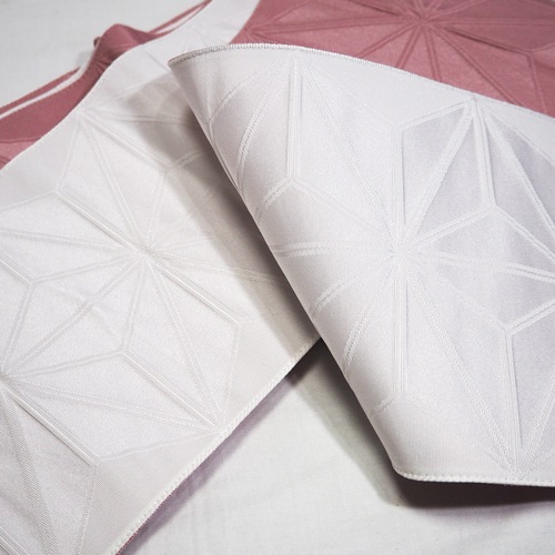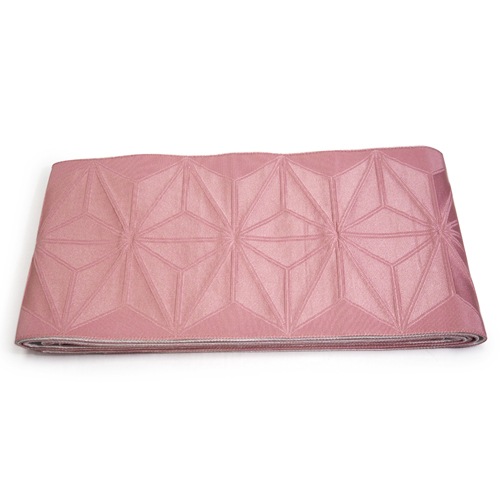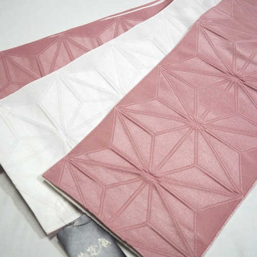 優しいピンクベージュとすきっとした白のリバーシブル帯。麻の葉の地模様が入っていて、大人っぽいっ仕上がりになっています。