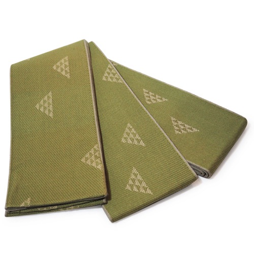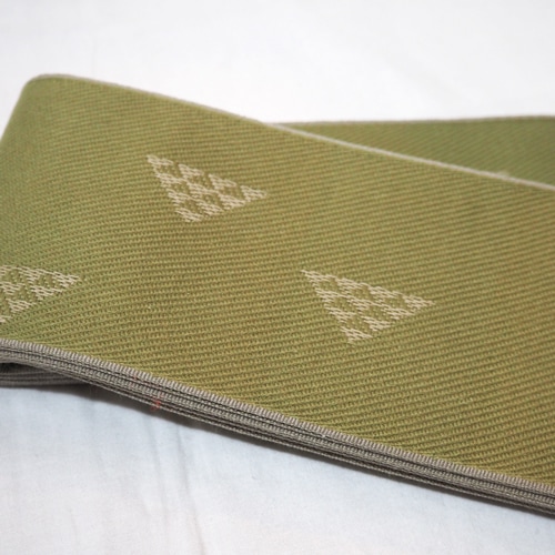伝統的なウロコ柄が織られた薄鶯色の角帯です。 裏は渋ベージュの無地です。 濃い色の浴衣に合わせると渋く素敵です。