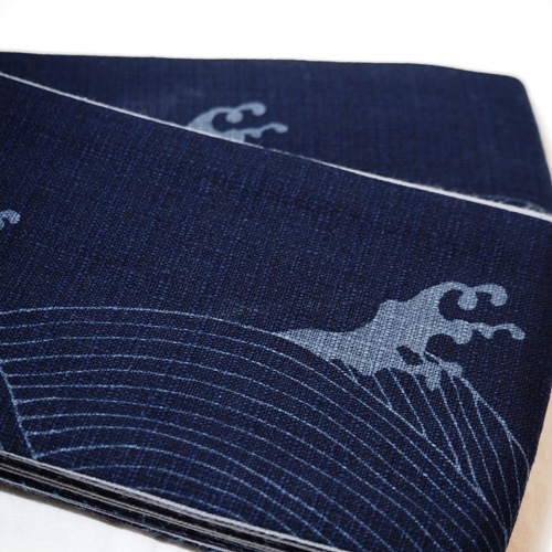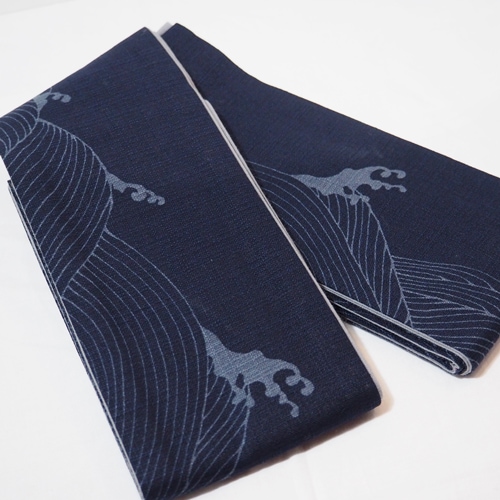 藍地に波柄が描かれた角帯です。 裏は銀鼠色の無地です。 あまり柄の細かくない大胆な柄使いや 淡い色使いの浴衣と合わせると素敵です。