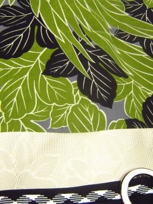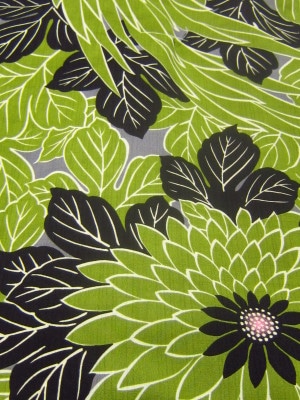 グリーンと墨色の大胆な菊柄の浴衣です。 大きな菊柄とツートンがとても大人っぽい印象で、>南のアジアの国で夕日を見ながら涼む・・・そんな雰囲気を感じます。 夏の旅のお供にいかがでしょうか。