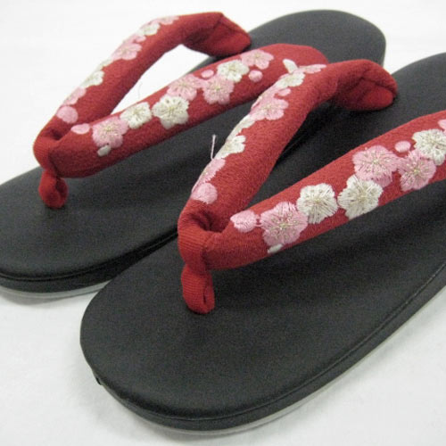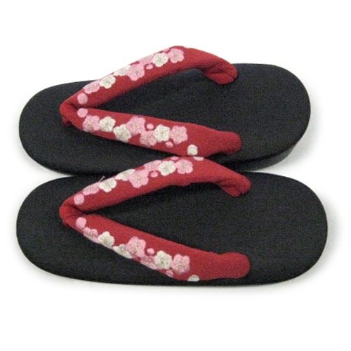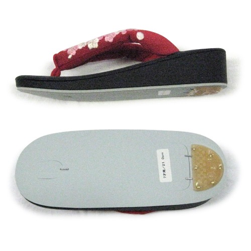 黒台にちりめんに桜の刺繍がかわいい赤の花緒の草履です。 シンプルなお草履なので、コーディネートもしやすいですね。