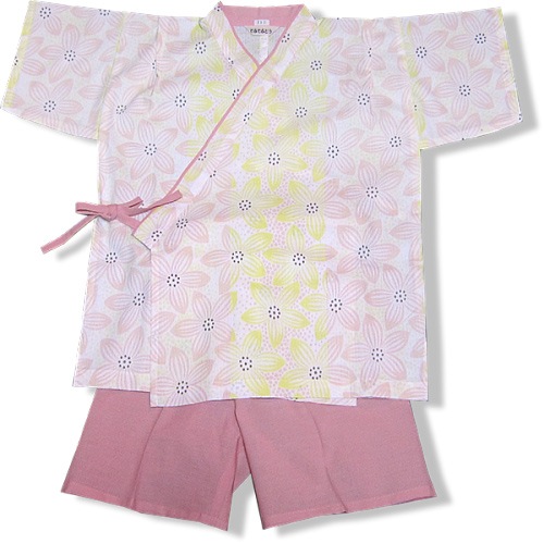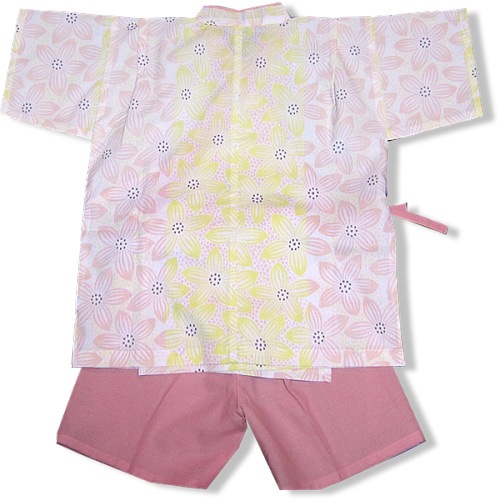 花柄でとっても可愛い子供用甚平です。 全体にシャーベットカラーでまとめました。 淡いピンクとイエローでとても優しい色使いです。 ふんわりと柔らかな涼しさを感じる甚平に仕上がりました。 お子様の柔らか肌に優しいゴムを使用しているので、締め付け感も軽減。 上着丈は少し長めで、お出かけや、お風呂上りの後に。 そのまま眠ってしまってもおなかを冷やさない丈になっています。 綿地なので、吸水性に優れ、お洗濯もラクラク。 浴衣地の特徴である着心地の良さと、涼しさは言うまでもありませんね。 クーラーを使わないエコな生活にピッタリの一着です。