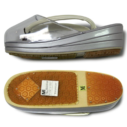 雨の日にお使いいただける、ポリエステルの爪皮付雨用草履です。 水が草履にしみこまないように各部を隙間なく接着し、裏底には滑りにくいようにゴムの滑り止めがついています。