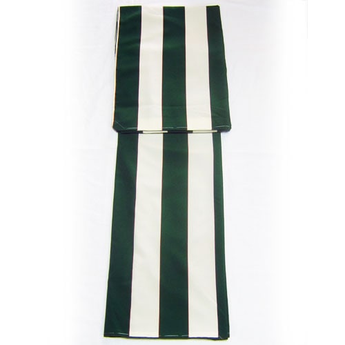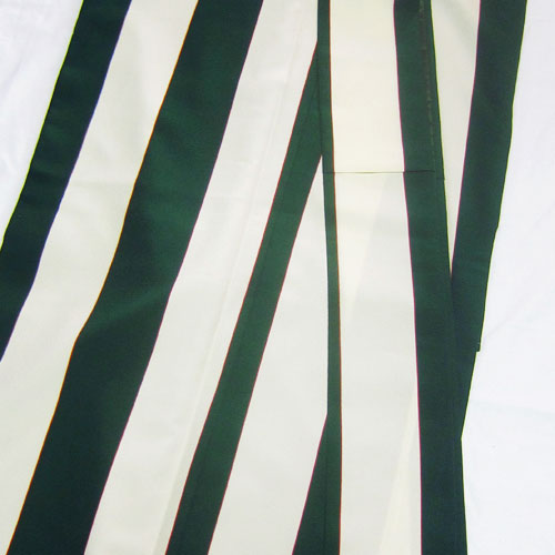 オフホワイトの様な胡粉色と鮮やかな緑茶色の太い縞模様が印象的な一枚です。緋色(渋いオレンジ系)や黒の横縞などを合わせるとよりレトロモダンが引き立ちます。