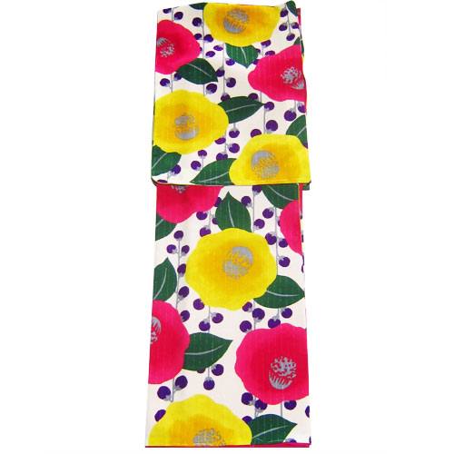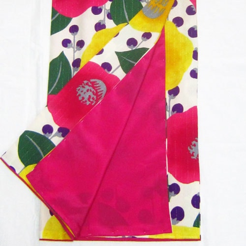 レトロポップな色使いで古典の椿・梅・菊が描かれた花盛り柄がとても華やかで色っぽい一枚です。