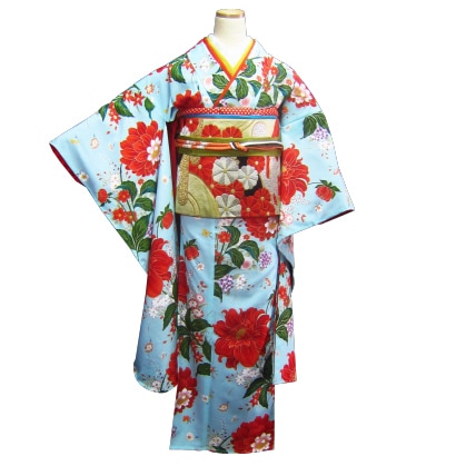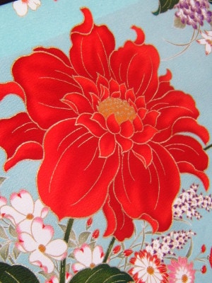 優しい露草(つゆくさ)色地にダリアの振袖です。