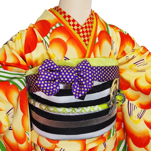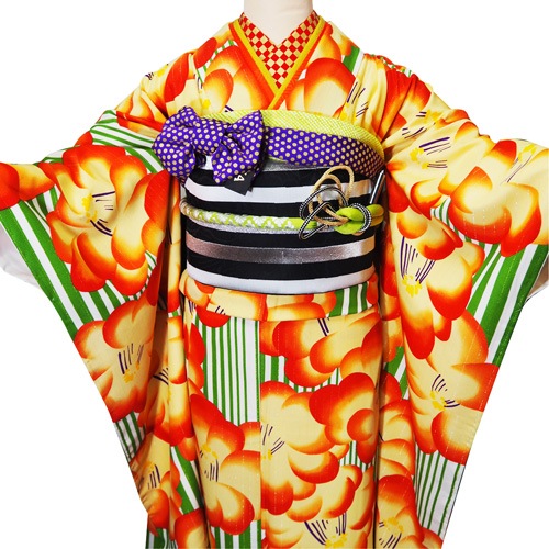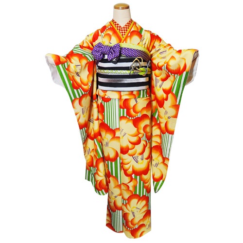 グリーンの縞に桃椿柄の大正ロマン風の振袖です。 大胆な柄使いが印象的で黒や紫との相性がとても良いです。