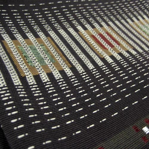 濃茶目の名古屋帯。変わった幾何学柄が入っています。