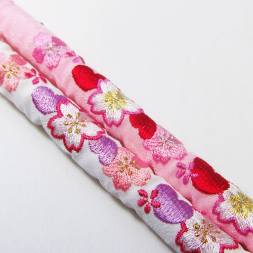 先端がチューリップの形をしたかわいい帯締。縮緬素材に桜柄の刺繍がしてあります。桜の刺繍に合わせた桜の地模様のある生地で仕立てられています。カラーは全部で、ピンク、ホワイトの2色。