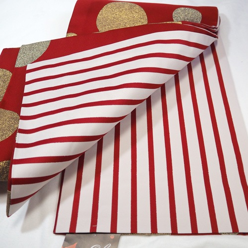 裏は赤と白のコントラストがとても素敵な細めの横縞(ストライプ)で、 着物の柄を生かしてくれる万能な帯としてもご利用頂けます。 可愛く個性的ですが帯締や帯揚などの小物を生かしてくれます。