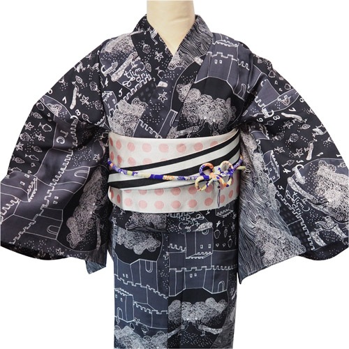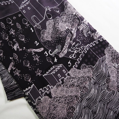 シックなモノトーンに城壁や孔雀などがツモリチサトらしいタッチで描かれています。 パッと見シックなのによくみると遊び心が満載なデザイン。 半襟や長襦袢を着ることで夏のお着物として、お出掛けなどにも十分着ていただけます。