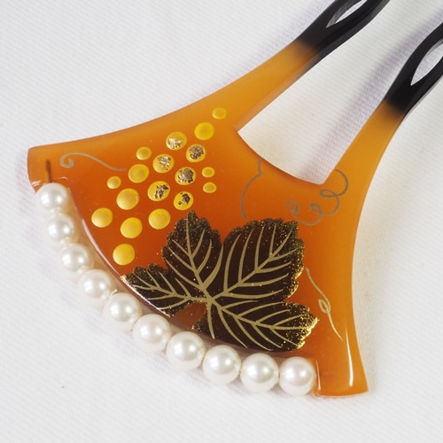 上品な鼈甲風のバチ型かんざし。 先端にパールが並んでいて華やかです。 ぶどうの柄が描かれています。
